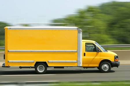 A bright yellow truck van speeds down the highway. Copy space on side of van.