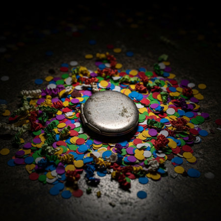 Confetti obscures an individuals face, reflecting their mix of hopes and anxieties in a vibrant, celebratory atmosphere.