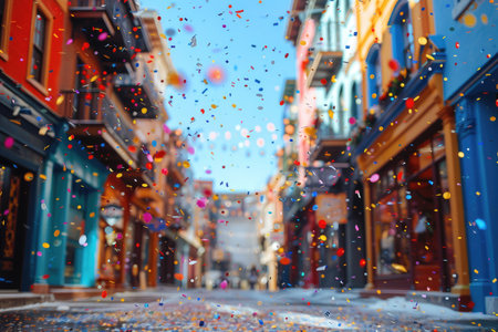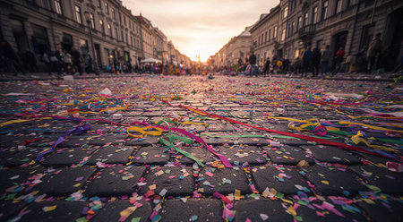 Vibrant street festival at sunset with colorful confetti and crowds. That the image is generated using AI.