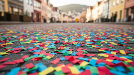 Bright multicolored confetti covers the ground on a busy street with pedestrians walking around.