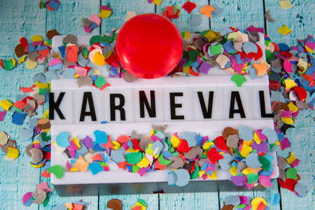 Krapfen, Berliner or donuts with streamers, confetti and mini marshmallows on white wooden background. Colorful carnival or birthday image, top view