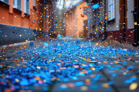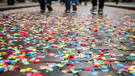 A vibrant carpet of colorful confetti covers the ground, with blurred human feet visible in the background of an outdoor celebration.