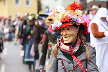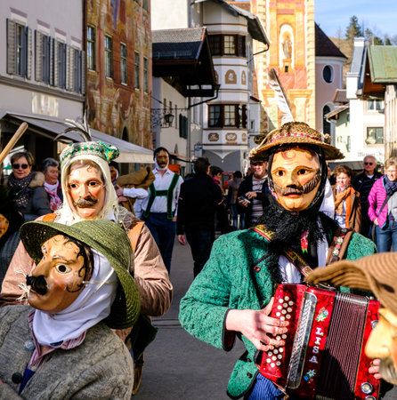 Mittenwald, Germany - February 20: participants of a parade with traditional disguise with large wooden masks and historic costumes called 'maschkera' on February 20, 2020 in Mittenwald