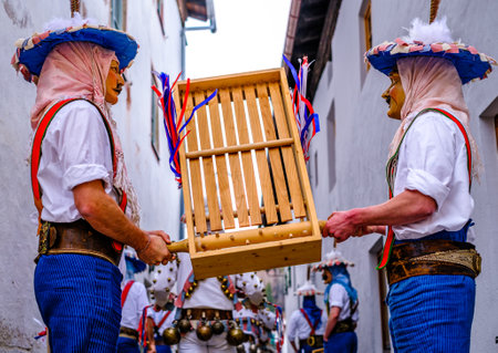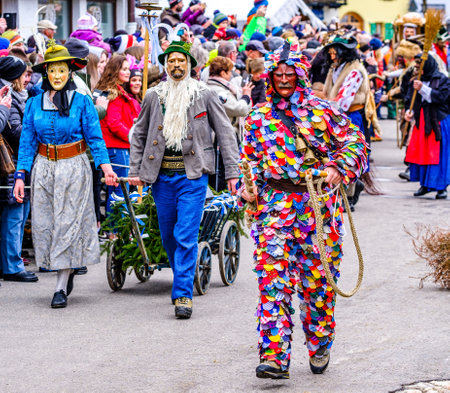 Mittenwald, Germany - February 24: Participants of a parade with traditional historic costumes to drive out the winter called 'maschkera' in Mittenwald on February 24, 2022