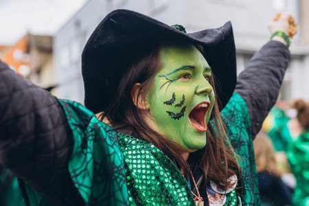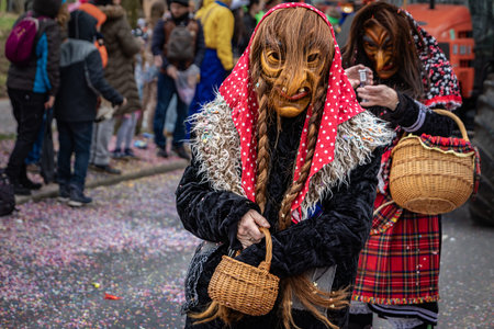 Zug, Switzerland - March 1, 2025: Costumed participants in witch attire and Larve masks celebrate the Fasnacht winter carnival at a festive parade
