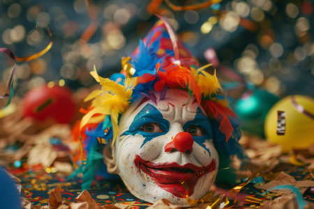 Colorful clown mask amidst confetti, symbolizing fun and festivities, with a bokeh background