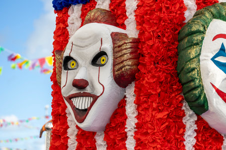 Detail from a decorated vehicle on the colorful Carnival (Carnaval) Parade festival on Quarteira city, Portugal.