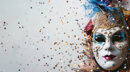Carnival party background. Venetian mask on white background with confetti. Copy space
