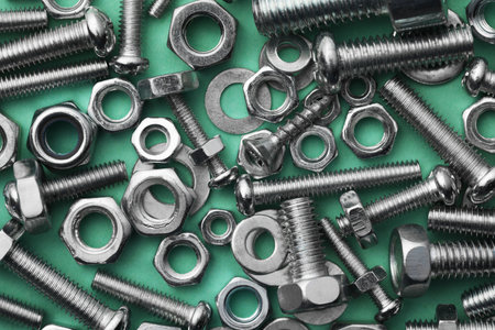 This close-up image features a collection of metallic nuts and bolts scattered across a textured surface, highlighting the intricate details of industrial hardware.