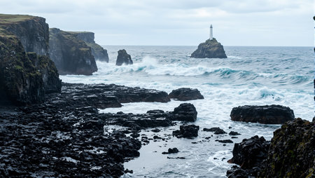 Icelandic coastline with black volcanic rocks crashing waves and distant lighthouse