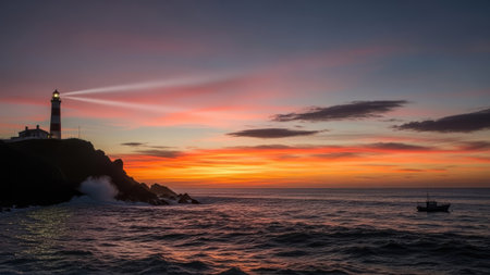 The Majestic Sunset: A Beautiful Lighthouse on the Rocky Coastline, Guiding Travelers towards Serenity and Adventure amidst the Scenic Ocean Landscape