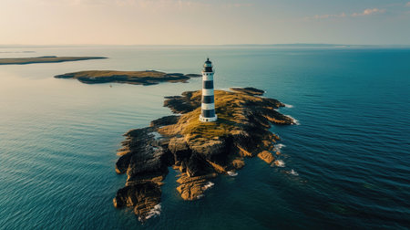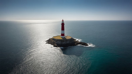 A striking red and white lighthouse sits on a rocky island, surrounded by the calm blue waters of the ocean, providing guidance to passing ships from an aerial perspective. AI generated image