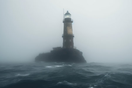 Eerie lighthouse in stormy misty weather. Marine lighthouse tower in foggy space. Generate ai