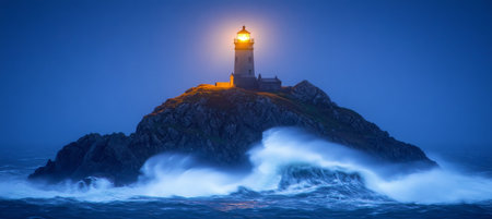 A picturesque lighthouse sits on a rugged cliff, overlooking the turbulent sea. Waves crash against the rocks, creating a striking contrast as twilight descends over the landscape.