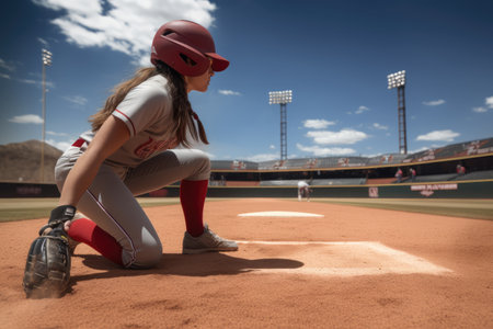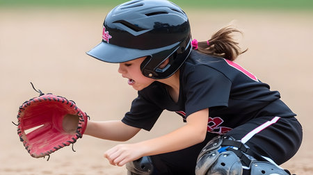 Young girl crouching, ready to catch a ball, wearing softball gear. Dynamic action shot, natural light, outdoor setting. Ideal for sports or youth-related projects.