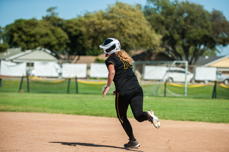 Black uniform softball player running around to second base.