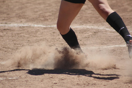 Athletic girls in action playing in a softball game