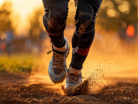 Young girl running on a baseball field, bat in hand, during a game. Warm sunlight, earthy tones, dynamic action shot. Ideal for sports, youth, and activity themes.