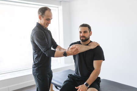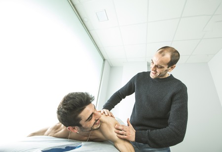Chiropractor massaging a young man shoulder. Concept of physiotherapy and recovery from an injury.