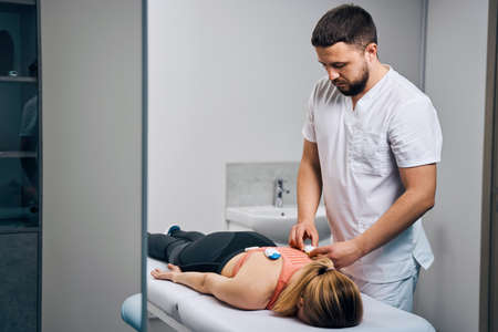 Therapist placing electrostimulator on woman stomach. Specialist in massage parlor puts electrodes