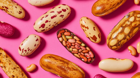 A stunning arrangement of diverse legumes displayed on a bright pink background. This vibrant composition highlights the textures and colors, perfect for food-related themes.