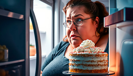 Corpulent man looking at chocolate cake with whipped cream, unhealthy food