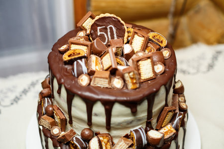 A tasty decorated Birthday Chocolate Cake with Cream and Nuts on the table