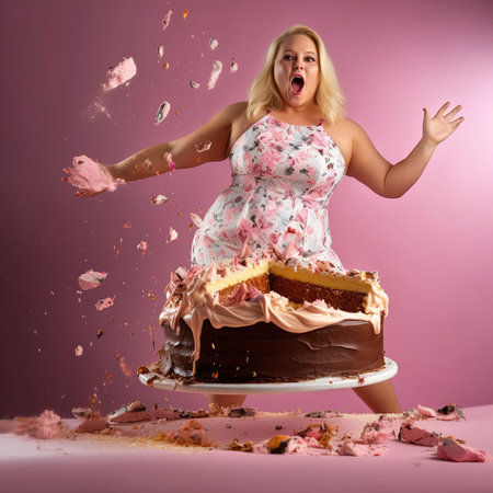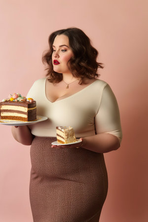 Plus Size Young Woman Opened Her Mouth About To Eat Chocolate Cake With Cherries, Hungry Caucasian Model Holding Plate With Dessert Going To Eat It While No One Sees