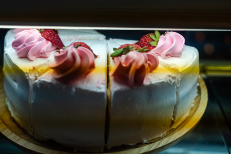 Pink cake decorated with marshmallow and cherry