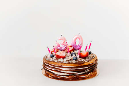 birthday cake with candles and the number thirty. traditional sweetness.