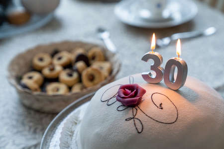 Birthday celebration cake with burning candles in the form of numbers and set birthday table. Birthday celebration at thirty years.