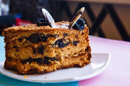 Delicious cake on white table close-up selective focus.