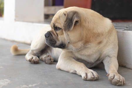 Fat brown old dog lying in front of the door and waiting for his owner to come home. Lonely cute dog lies on cement floor and looks sad eyes. Lazy dog napping. Lifestyle of elderly pet at home concept