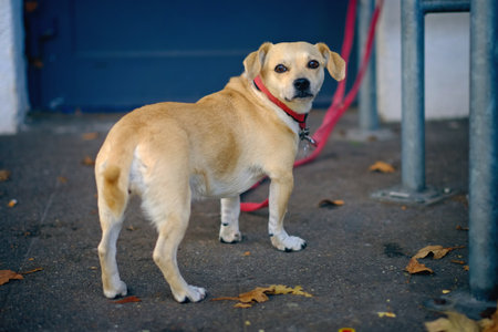 Cute beige dog sitting on the ground and looking up at camera