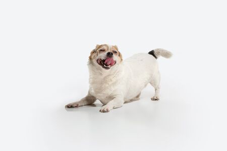 Chihuahua companion dog on the run. Cute playful creme brown doggy or pet playing isolated on white studio background. Concept of motion, action, movement, pets love. Looks happy, delighted, funny.