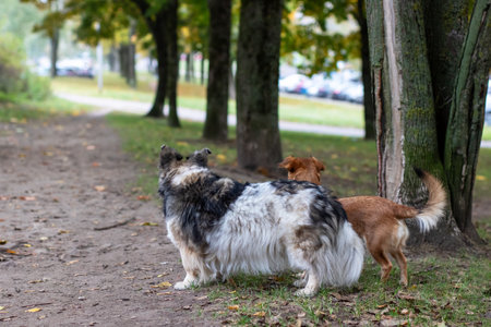 In a lovely park, two dogs can be seen standing together next to a tall tree, enjoying the day and the fresh air all around them
