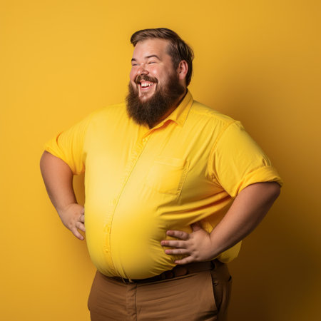 Fat man smiling in yellow t-shirt on yellow background isolated AI