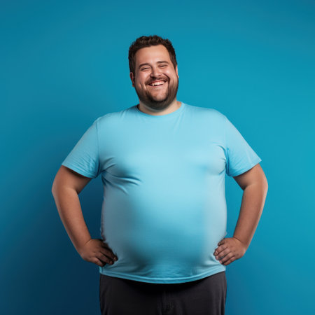 Fat man smiling in blue t-shirt on blue background isolated AI