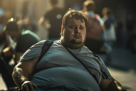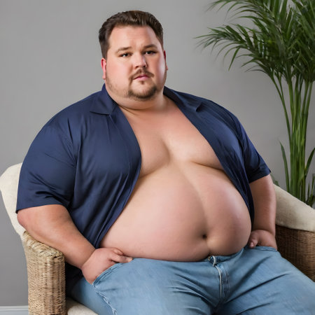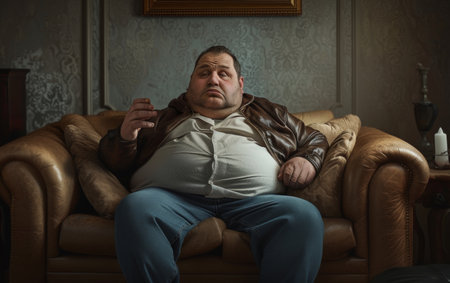 A portrait of a big, overweight man with a pronounced fetal belly. The image highlights the issue of obesity and its impact on health. illustration created by Generative AI