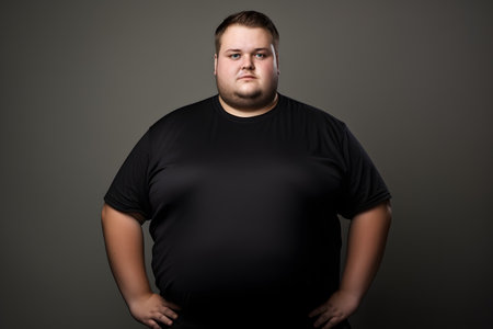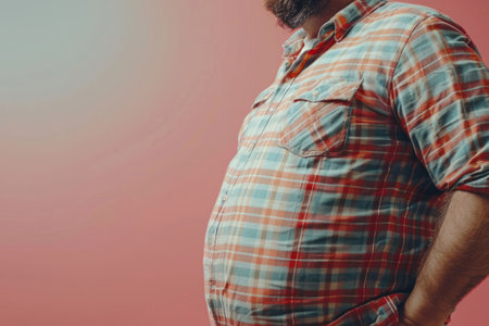 Health awareness: Closeup of overweight man in tight shirt, highlighting the importance of self-care and embracing body positivity