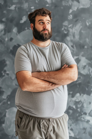 Fat man with big breasts on a gray background. The concept of overweight and healthy lifestyle. Generative AI.