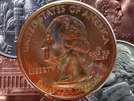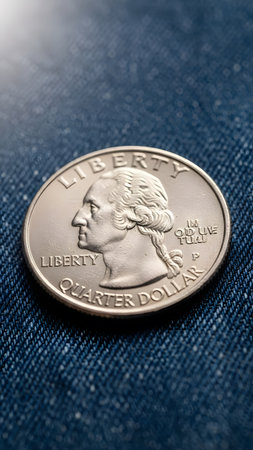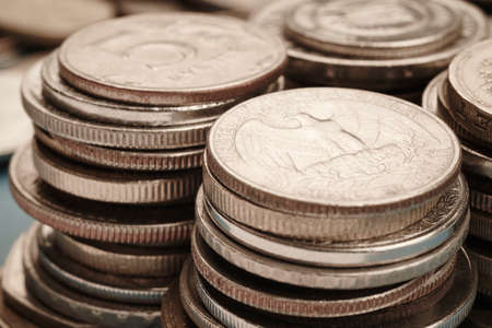 American quarter dollar coins close-up, old 25 us cents coins with small depth of field