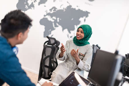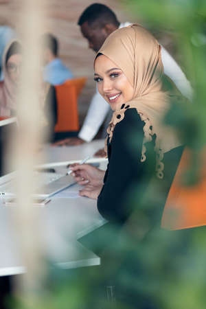 Multiethnic startup business team Arabian woman wearing a hijab on meeting in modern open plan office interior brainstorming, working on laptop and desktop computer. Selective focus