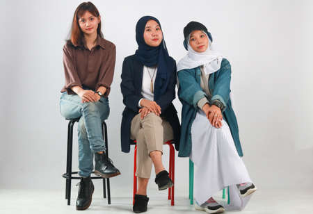 Fashion portrait of three best friends posing in studio
