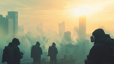 Silhouetted figures wearing gas masks stand on a rooftop, overlooking a smoky urban skyline at sunrise. A haunting yet inspiring view of resilience.