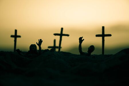 Silhouette some zombies on the cemetery walking around at sunset. Horror Halloween concept. Selective focus