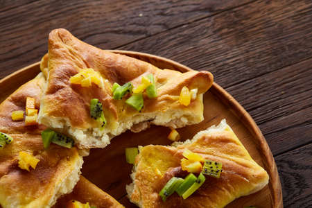 Delicious homemade fruit pies with tasty kiwi and orange stuffing on wooden tray over rustic wooden background, flat lay, close-up, selective focus. Some copy space for your inscription. Yummy exotic dessert. Healthy eating concept.