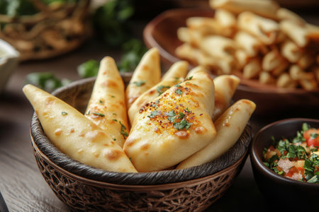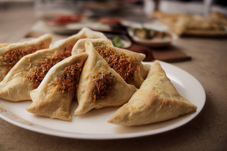 Golden brown sambousek are arranged on a plate, waiting to be enjoyed as part of a delicious middle eastern meal