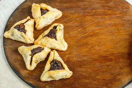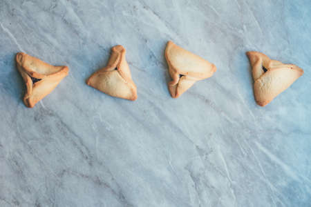 Hamantaschen cookies or hamans ears for Purim holiday celebration. top view.