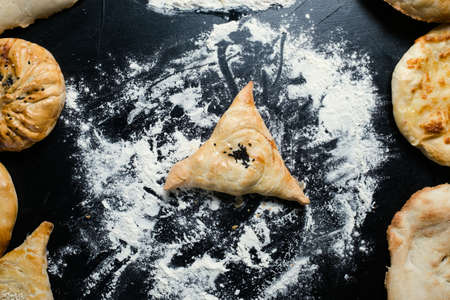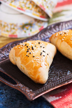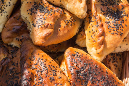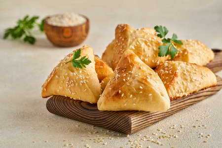Traditional Tatar pie sprinkled with black sesame seeds. Triangular-shaped stuffed cakes. Food background, top view.